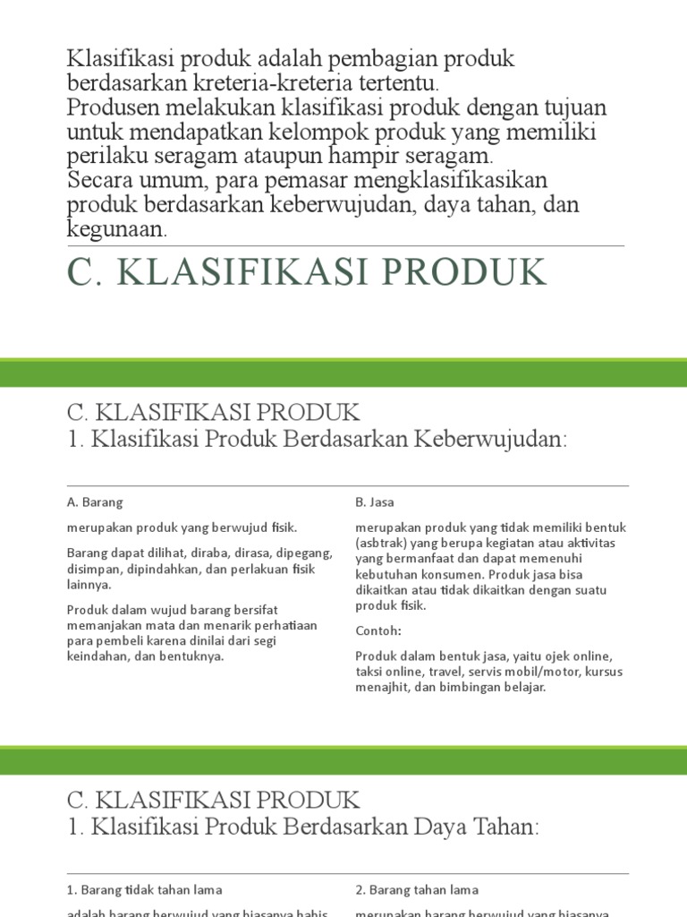 Yang dimaksud produk ialah hasil proses produksi yang dilakukan oleh produsen atau perusahaan yang nantinya akan dijual kepada konsumen yang membutuhkan. Selain barang dapat diklasifikasikan menurut daya tahannya, produk juga dapat diklasifikasikan berdasarkan siapa konsumen (siapa pembelinya) dan juga untuk apa produk tersebut dikonsumsi. Klasifikasi produk dapat dilakukan atas berbagai macam sudut pandang. Para ahli bisnis atau pakar ekonomi dunia punya pendapat berbeda dalam mengklasifikasikan kriteria jasa. Secara umum terdapat 2 macam produk yaitu produk konsumsi dan produk industri. Berdasarkan kriteria ini, produk dapat dibedakan menjadi barang konsumen (consumer's goods). Bisnis menggunakan barang modal untuk menghasilkan produk dan layanan lain, termasuk barang konsumen. Stakeholder adalah istilah dalam dunia bisnis, simak pengertian, klasifikasi, peran dan fungsi stakeholder , fungsi dan peran stakeholder berikut ini. Produk konsumen convience product speciality producy shopping product unsoght product produk yang tidak di sadari konsumen produk produk yang tidak di anggap penting utuk dibeli kecuali dalam keadaan penting 2. Berikut ini contoh strategi pemasaran alhasil, perkembangan bisnis bisa menjadi kelancaran dan berjalan dengan stabil untuk jangka jika konsumen merasa senang dan puas dengan kualitas produk anda, mereka akan mengingat nama. Klasifikasi produk berdasarkan kegunaannya berdasarkan kegunaannya produk diklasifikasikan menjadi dua, yaitu: Biasanya barang konsumen dapat diklasifikasikan menjadi 4 jenis, yaitu. Jenis, klasifikasi, ciri, contoh, atribut, tingkatan, dimensi kualitas, strategi.